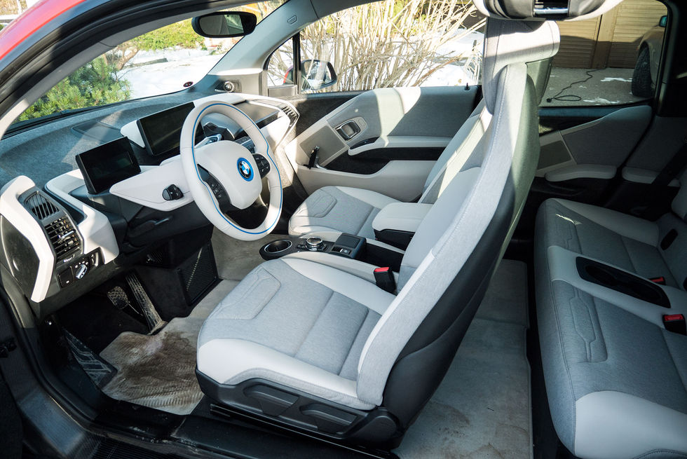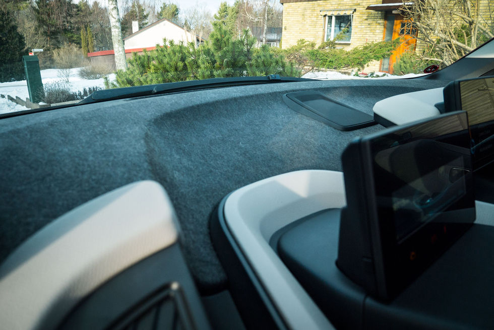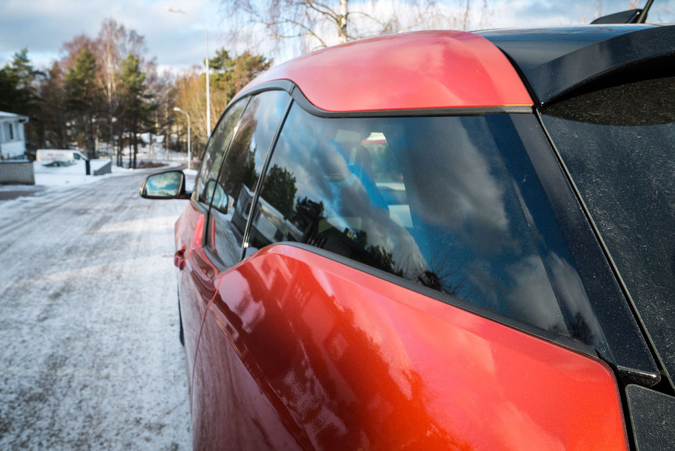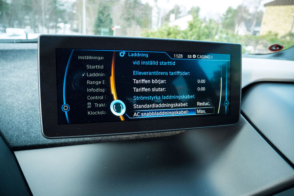 KörkänslaBilen plockades ut på en måndag och efter den sedvanliga synkningen av mobiltelefon, ratt- och stolsinställning och okulärbesiktning av alla knappar, vred och spakar bar det iväg. Och det tar nog inte mer än fem minuter innan jag slutar tänka på att jag sitter i en elbil. Jag sitter i en BMW. Komforten är som den ska, styrningens respons är som vilken annan modern bil som helst och ljudnivån är lagom dämpad. Det enda som saknas är motorljudet, men i den här bilen kan jag inte säga att man direkt saknar ljudet av den surrande Range Extendern - en 120 kilo tung motorcykelmotor på 650 kubik som fungerar som räckviddsförlängare. Denna motor är inte kopplad till drivhjulen utan fungerar endast som generator för att ladda upp batterierna igen. När den väl hoppar igång så påminner ljudet nästan om det där man fick fram när man som yngling plågade maskinerna i syslöjden. I rent elläge är bilen tyst, men inte jättetyst. De stora och smala hjulen på i3:an gör sin beskärda del för att hålla ljudnivån uppe så att man inte somnar och bilens högbyggda kaross är inte främmande för att ta emot vinden på ett susande vis. Men sen så hör man ju mer av vägen och omgivningen när det inte är en motor som surrar också, vilket förmodligen gör att man lägger märke till fler saker. Men jag trodde att det skulle vara tystare.Som sagt så känns bilen som vilken BMW som helst att köra, och det är ett rejält plus. BMW är kända för att bygga körglada bilar och den här hamnar också i detta fack. Inga rullningar i karossen när man svänger tvärt, inget sladder i ratten och en vändcirkel som verkligen imponerade. Bilen känns rejäl trots att den är liten, och den får plats i princip överallt.Eftersom bilen bara har en växel och man inte kan motorbromsa som på en vanlig bil så gör elmotorn detta åt dig. Så fort du släpper gasen så bromsar den upp ganska så kraftigt faktiskt, mer ju snålare läge du kör i. Ser du bara till att planera din körning bra så behöver du nästan aldrig ens flytta foten från gaspedalen, vilket är mycket bekvämt och något man vänjer sig vid väldigt snabbt. Det första som slog mig när jag utövade detta var att bilen stannade till så kort efter att jag släppt gasen och att bakomvarande då inte uppfattade att jag helt plötsligt stod i princip helt still. Detta har ju BMW såklart tänkt på, och så fort man släpper gasen så tänds bromsljusen upp. Allt samtidigt som bromsandet omvandlas till energi till batteriet. Briljant.Det finns tre olika körlägen att välja mellan, Comfort, Eco-Pro och Eco-Pro+. När man startar bilen är det alltid Comfort som är aktiverat och man får manuellt själv byta körläge via en knapp till höger om stolen. I Comfort är bilen riktigt kvick och trampar man på trycks man faktiskt bak i sätet en bit. Alla som har åkt med har beskrivit bilen som pigg och den känns faktiskt alert. I vanlig trafikrytm är man alltid först iväg om man så vill, men genast kickar snålheten in och man blir lite ledsen när man ser hur mycket el som går åt när man gasar hårt. Då kan man flippa över till Eco-Pro vilket direkt gör att bilen optimeras och blir snålare. Gaspedalen blir trögare och det händer helt enkelt mindre när man trampar på. I det snålaste läget, Eco-Pro+, stängs till och med klimatanläggningen av och nu så här i vintertid blev det snabbt kallt i kupén. Ett bra läge för sommarens varma dagar, men inte nu på vintern. I detta snåla läget begränsas även toppfarten till 90 km/h, men om man vill kan man manuellt gå in och ändra detta i infotainmentsystemet.Range Extendern kopplas in när strömmen är slut eller när man manuellt via displayen väljer att den ska hoppa igång. Detta går dock inte att göra förrän batterinivån har sjunkit under 75 %. Första gången när den kopplades in på motorvägen var det oklart om den levde men på displayen hade stapeln för räckvidden hoppat från el till bensin så allt verkade vara i sin ordning. Elförbrukningen la sig stabilt medan bensinen sakta men säkert började ticka nedåt. Först när hastigheten blev lite lägre hörde man ljudet som jag tidigare nämnt, och baksätespassagerarna tyckte att det lät ganska så mycket faktiskt. Range Extendern gjorde sitt jobb i alla fall och såg till att elen hölls på en stabil nivå. Men. Den lilla bensintanken på nio liter räcker inte länge. I motorvägsfart sörplar motorn i sig bra mycket mer bränsle än vad man kan tro och vi kom nog inte längre än nio mil innan det var dags att tanka igen. 0.6 liter per mil som uppges är mycket svårt att komma ner till.InteriörNär man slår upp framdörren och "självmordsdörren" möts man av framtiden. Här ser det nästan ut som en konceptbil, fast på ett bra sätt. Inget överdrivet fantasifullt utan fungerande och nytänkande. Den som har ögonen med sig noterar den blottade kolfibern vid trösklarna, en häftig detalj som man gärna lyfter fram när någon kommer fram vid laddstolpen och snackar. Det man också direkt möts av är de ljusklädda stolarna. Tjockleken eller snarare avsaknaden av den på framstolarna imponerar och man ställer sig genast frågan om de är bekväma att sitta i, och svaret är ja. Känns precis som vilka andra välbyggda stolar som helst, och de ger ingen träsmak trots rätt så många mils körning. Den bakhängda bakdörren underlättar insteget till baksätet men den går endast att öppna om framdörren är öppen, och framdörren är lång. Det kan bli lite trixigt om man står tajt till att skyffla in alla människor som ska in, men man vänjer sig.Eftersom bilens kaross består av en balja i kolfiber så kan man bygga inredningen lite annorlunda. Det finns exempelvis ingen kardantunnel som tar massa plats och golvet kan göras helt platt. Det gör att man får lite "käcka" förvaringsställen lite här och var, bland annat kan man ställa på